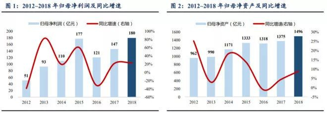 中国太保通过旗下子公司提供各类风险保障、财富规划以及资产管理等产品和服务,业务覆盖整个保险产业链。2012年至2018年,中国太保归母净利润从51亿增至180亿,6年间足足增长了3倍多,复合增长率达超过23%;归母净资产也从2012年的962亿扩大至2018年的1496亿。