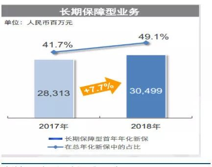 2017年3月监管部门实施了对整个保险行业影响重大的《中国第二代偿付能力监管制度体系建设规划》,各保险公司纷纷将经营重心转移至发展长期保障型业务。通过2年的转型,中国太保在业务结构上的优化取得了不错的成绩。如下图显示,2018年公司长期保障型业务的占比提升至49.1%,较2017年同比增长7.7%。