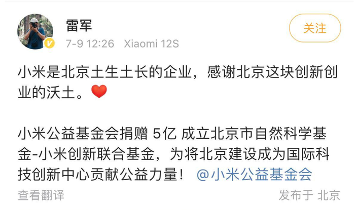 紫金财经7月9日消息 雷军今天中午在个人账号上表示,小米公益基金会捐赠5亿成立北京市自然科学基金-小米创新联合基金,重点支持本市人工智能、电子信息、智能制造等领域的基础研究。