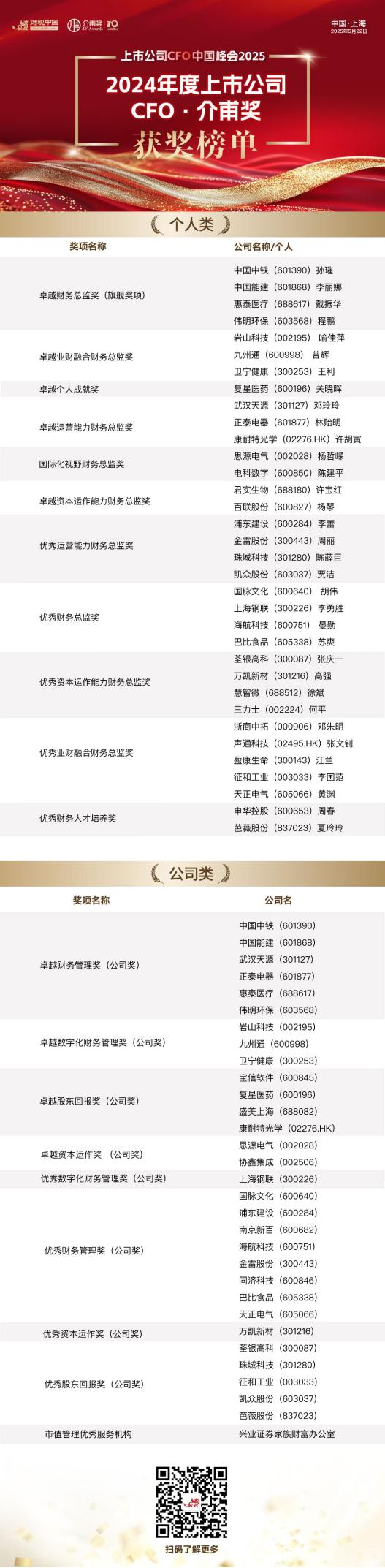5月22日,由中国总会计师协会财务管理专业委员会、上海市商业会计学会学术委员会指导,财视中国主办,兴业证券家族财富办公室、国泰君安资管、外企德科上海联合主办,复旦大学国际金融学院提供独家学术支持的上市公司CFO中国峰会2025暨2024年度上市公司CFO·介甫奖颁奖典礼在复旦大学盛大召开。峰会以“优化市值管理,增强财务韧性”为主题,汇聚200余位上市公司CFO、金融机构高管及学界领袖齐聚一堂,深度探讨BANI时代下的财务战略破局之道,共同见证行业标杆的荣耀时刻。