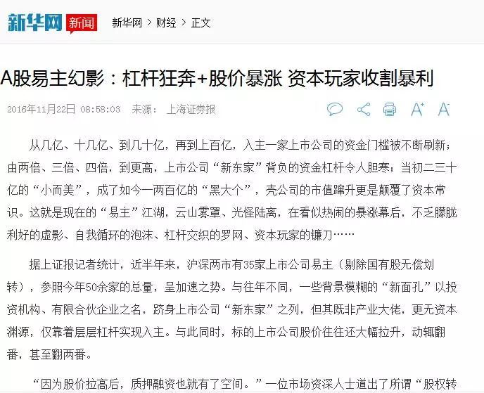 2016年11月22日,上海证券报发表重磅文章《A股易主幻影:杠杆狂奔+股价暴涨 资本玩家收割暴利》,文中质疑:“从几亿、十几亿、到几十亿,再到上百亿,入主一家上市公司的资金门槛被不断刷新;由两倍、三倍、四倍,到更高,上市公司“新东家”背负的资金杠杆令人胆寒;当初二三十亿的“小而美”,成了如今一两百亿的“黑大个”,壳公司的市值蹿升更是颠覆了资本常识。这就是现在的“易主”江湖,云山雾罩、光怪陆离,在看似热闹的暴涨幕后,不乏朦胧利好的虚影、自我循环的泡沫、杠杆交织的罗网、资本玩家的镰刀……”