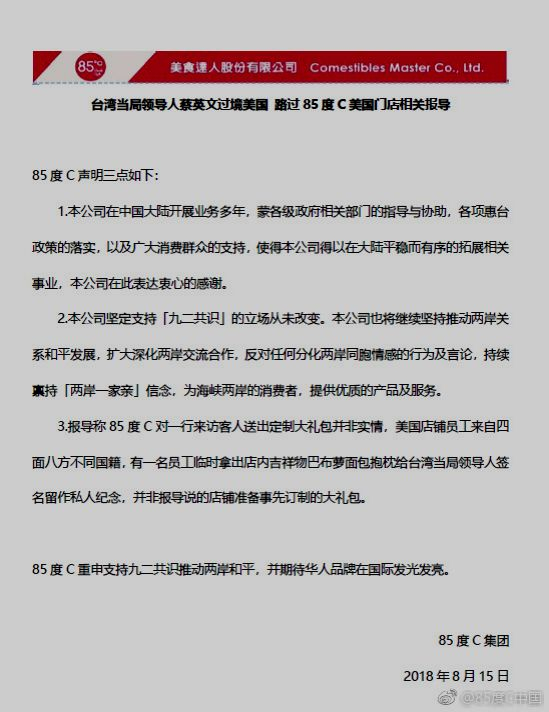 果不其然,8月15日早,85度C中国在其官网(包括官方微博)上,发表了一份“三点声明”,既表明了在“九二共识”上的立场,也解释了所谓“定制大礼包”事件的相关情况。