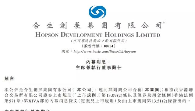 13日早间,合生创展对外公告称,朱孟依辞任公司董事会主席及执行董事职务,其女儿朱桔榕接任公司董事会主席。