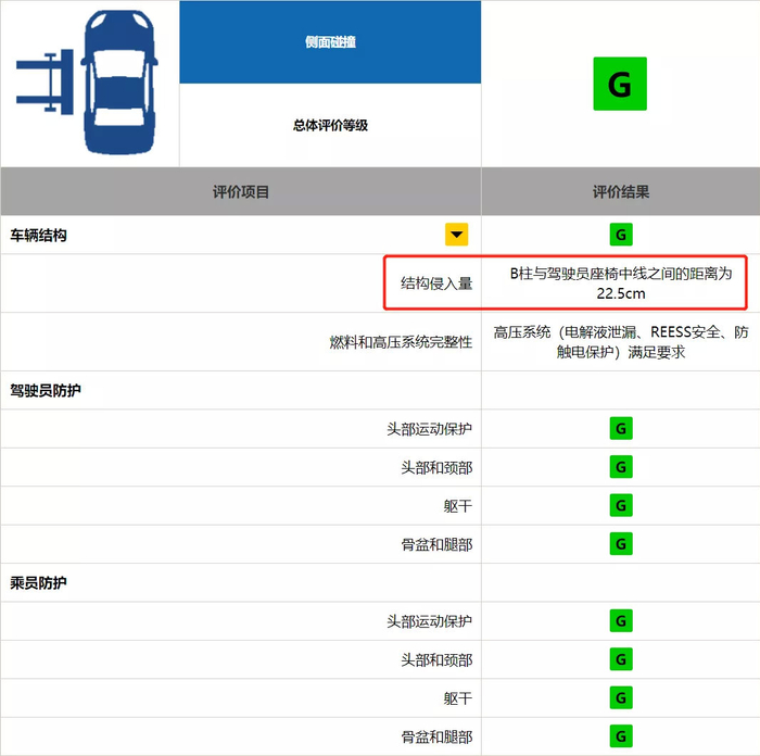在侧面碰撞中,Model 3的B柱距离驾驶员座椅中线还有22.5cm,这个成绩不仅远远超过了12.5cm的最低标准线,而且还超越了此前由马自达3保持的20.5cm的中保研轿车B柱强度最佳记录。