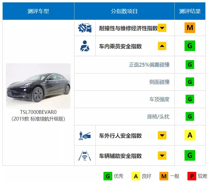 Model3参与测试的车型为2019款标准续航版,安全装备配置为驾驶员正面气囊、前排乘员正面气囊、前排侧气囊、前/后排侧气帘,搭载AEB。碰撞具体结果为:耐撞性与维修经济性指数:M(一般),车内成员安全指数:G(优秀),车外行人安全指数:A(良好),车辆辅助安全指数:G(优秀)。