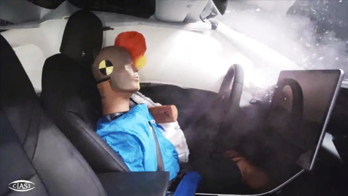 通过车外视角来看,Model 3在碰撞中的A柱强度非常不错,车头的吸能区完全发挥了作用,乘员舱结构完好。