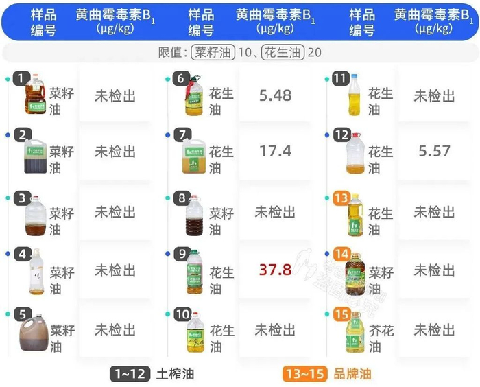 这次检测的 6 款土榨花生油中,4 款检出了黄曲霉毒素 B1 ,其中 7 号在超标的边缘徘徊,而 9 号直接超标了近 2 倍 !