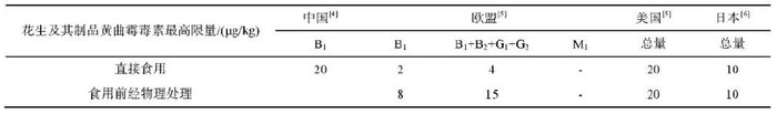 美国的标准限量虽然和中国相同,但规定却为黄曲霉毒素总量,而非仅针对B1而言。由此可见,我国花生制品黄曲霉毒素限量标准与欧盟、日本、美国相比存在一定差距,这是制约我国花生制品出口各国的重要原因。