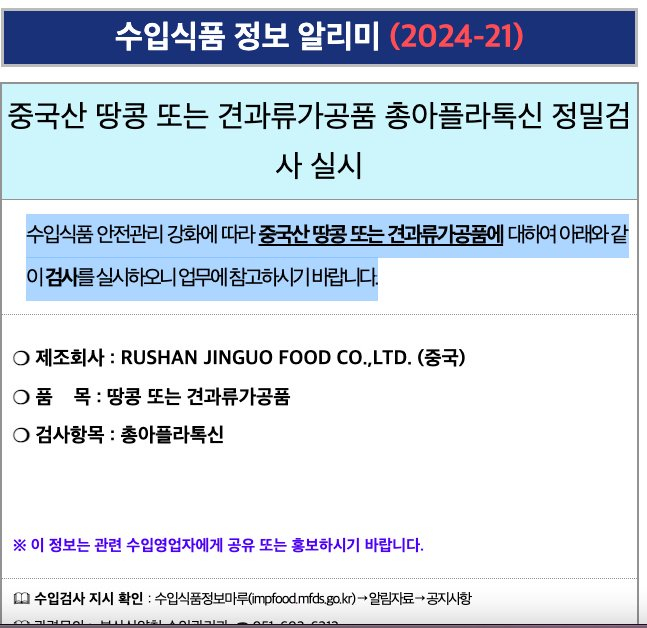 在此背景下,2024年3月6日,韩国食药部(MFDS)发布中国产花生及加工坚果黄曲霉毒素总量的检查指示,自发布之日起实施。