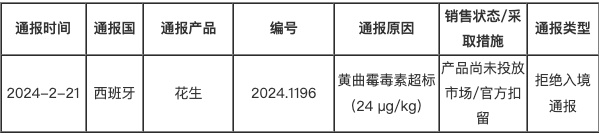 据欧盟食品饲料类快速预警系统(RASFF)消息,2024年2月21日,西班牙通报我国出口花生不合格。具体通报内容如下: