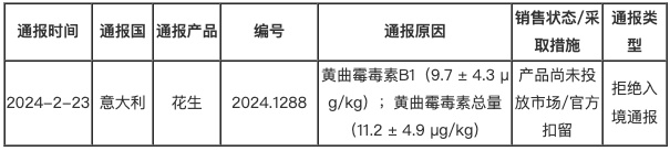 2024年2月23日,欧盟再次通报我国出口花生不合格。具体通报内容如下:
