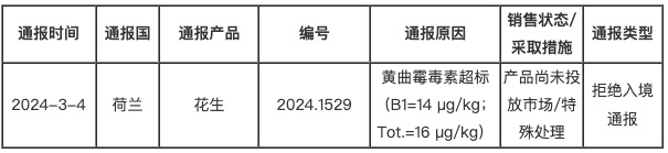 2024年3月4日,荷兰通报我国出口花生不合格。具体通报内容如下: