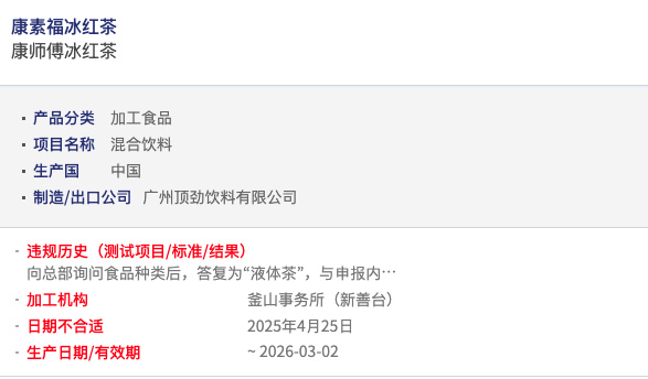 2025年4月25日,韩国食品药品安全部发布进口食品不合格名单,赫然有着国民饮料康师傅冰红茶的名字。