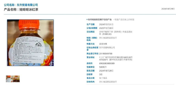 2024年8月29日,同样是韩国食品药品安全部发布的通告,因为在中国的娃哈哈冰红茶里检出焦糖色素,于是将此批产品认定为不合格产品。