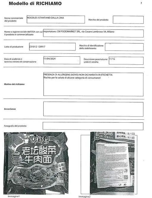 2024年4月2日,意大利发出公告,要求将一批来自中国的康师傅方便面召回,该批产品的意大利语说明标签中未注明鸡蛋过敏源。
