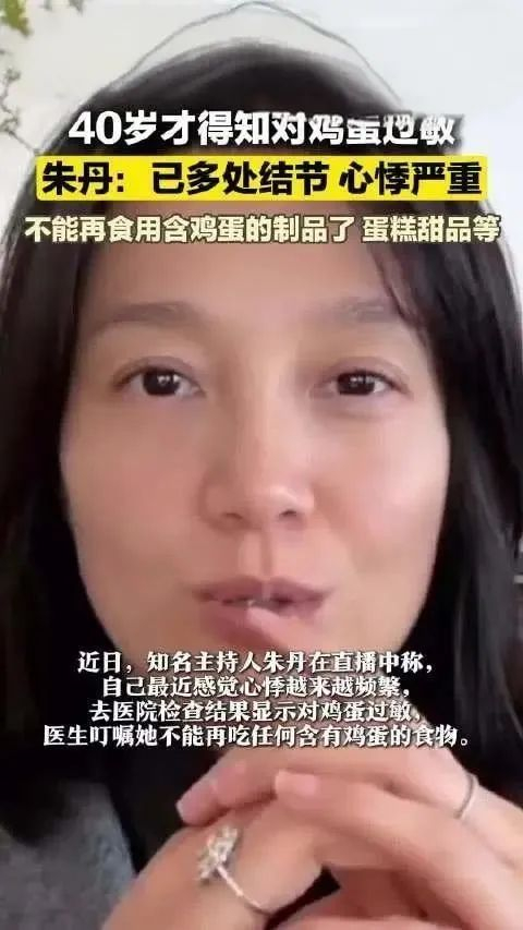 2024年12月11日,知名主持人朱丹在直播中自述不惑之年才得知自己是鸡蛋过敏者,多年不知不觉的过敏已导致她严重心悸,甲状腺和肺部等多处结节。