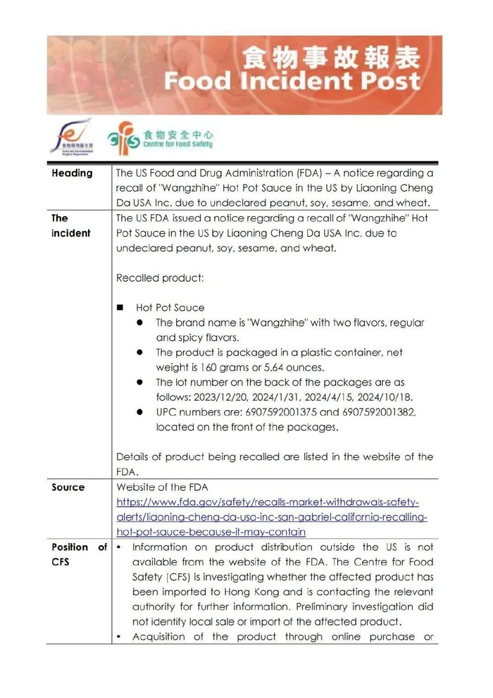 2025年3月11日,美国食品药品监督管理局(FDA)发布召回通报称,正在召回特定批次的中国王致和火锅调料,因为产品含未申报过敏原(花生、大豆、芝麻和小麦)。