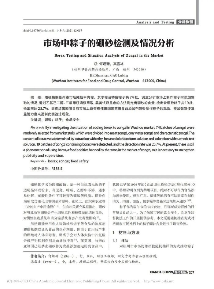 2021年,广西梧州市药品食品检验所的工作人员,随机抽取梧州市市场摊档中肉粽、回水粽及特色粽子共 74 批,调查分析市场上制作粽子时添加硼砂的情况。