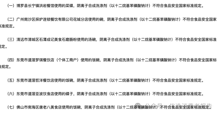 但这20批次不合格样品中,有7个犯的是同一个毛病——餐厅的碗中阴离子合成洗涤剂(以十二烷基苯磺酸钠计)不符合食品安全国家标准规定。