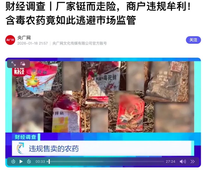 2026年1月18日,据央视《财经调查》栏目报道,个别地方的商户和个别企业,依旧在违规销售国家明令禁止及一些限制使用的含毒农药。