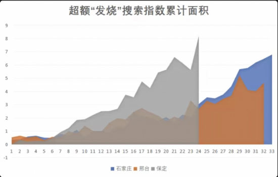 我们发现在这三个地区,当疫情达到顶峰时,这个“超额发烧搜索指数累计面积”的数值全部刚好达到80。这两个地区第一波疫情结束时,香港特别行政区的面积达到了160,台湾地区的面积达到了200,日本的最终面积是250。3)如果用百度搜索指数做类似的研究会有什么效果呢?我使用了本轮疫情进入群体感染最快、最早的石家庄、邢台和保定做了计算: