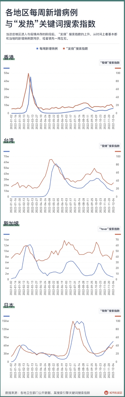 不仅是这三个城市,从全国范围看,新增感染者数量也在11月27日达到顶峰,并在最近十天来快速回落了。疫情防控的指挥棒消失后,病例增长数据立刻失效,此时我们怎样判断一个城市是否出现了群体感染,以及何时第一轮群体感染达到高峰呢?搜索指数,在这时可以帮上大忙。早在十多年前,就有研究使用Google搜索指数来预测流感爆发情况。这些研究后面证明可能在预测上确实会存在问题,但是在实况监测上一直做得很好。例如下图列出了从2022年以来香港特别行政区、台湾地区、新加坡和日本的“发烧”搜索指数与当地每周病例之间的关系。