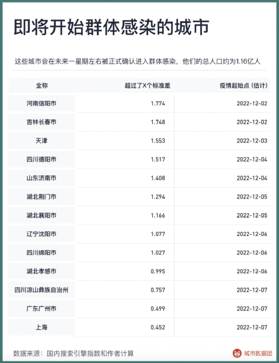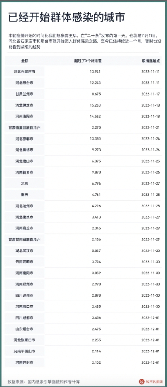 上图列出了六个城市在不同时间的“发烧”搜索指数,且根据每个城市的2022年前两周进行了标准化。可以看到,在今年的3月初和4月初,长春与上海分别出现了一个短期高点,长春在3月9日达到1.74,上海在4月10日达到1.57。这两个城市此时的“发烧”搜索,分别达到了基准水平的1.74倍和1.57倍。在时间点上,上海的“发烧”搜索最高的一天,与上海市新增感染者最多的一天完全一致,都在4月10日。之后的一波“发烧”指数高峰发生在10月的乌鲁木齐,最高值出现在10月20日,达到了2.60。这段时间与乌鲁木齐出现疫情的时间同样吻合。上海、长春和乌鲁木齐的例子显示 “发烧”搜索指数与较大规模的奥密克戎疫情高度相关。且当确诊人数不能完全反映当地实际状况时,“发烧”搜索指数依然忠实地呈现了疫情到底扩散到了什么程度。哪些城市正在开始群体感染在分析了多个地区的数据后,我们试着用 “发烧”搜索指数给出每个地区疫情开始的信号,主要包括两个部分:1,“发烧”搜索指数在过去7天内的平均值大于过去五年内该季度平均值的2个标准差。2,“发烧”搜索的Cox-Stuart检验在95%水平上出现显著上升趋势。这里的Cox-Stuart检验我们用到了7天数据。当以上两个条件同时满足时,我们便把上升趋势出现的第一天定义为该城市迈向群体感染第一天。2022年11月以来,出现了群体感染的城市依次如下表所示: