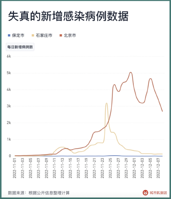从11月开始,越来越多的地区的病例出现了大幅度失真。我们虽然能在网络上看到石家庄、保定、北京等大面积感染的情况,但是在卫健委的病例发布中却看不到这样的数据: