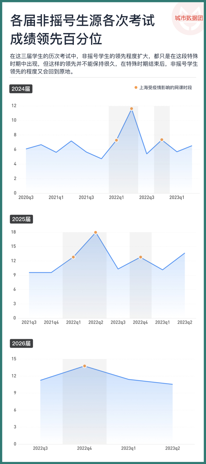 2026届学生没能赶上2022年春季学期的这段特殊经历,但在他们身上依然能够看到“鸡血”的作用。在2022年四季度,即2022年秋季学期的期末考试中,2024、2025、2026届非摇号学生的领先百分位分别扩大了1.9、2.4、2.5个百分位。