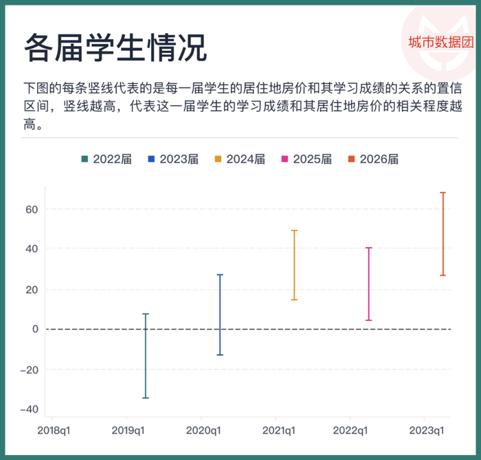 上图的每条竖线代表的是每一届学生的居住地房价和其学习成绩的关系的置信区间,竖线越高,代表这一届学生的学习成绩和其居住地房价的相关程度越高。