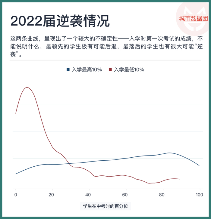 这两条曲线,呈现出了一个较大的不确定性——入学时第一次考试的成绩,不能说明什么,最领先的学生极有可能后退,最落后的学生也有很大可能“逆袭”。从数据来看,老师们的口头禅,无论是告诫尖子学生的“逆水行舟不进则退”,还是为暂时后进学生鼓劲的“乾坤未定你我皆是黑马”,都是有道理的。
