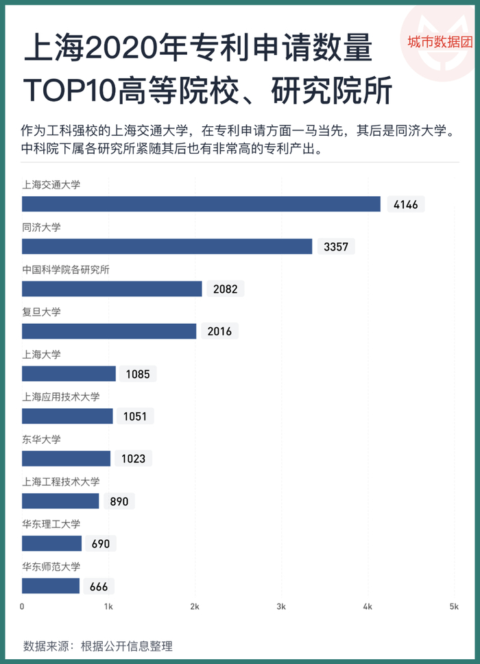 首先来看高校,上海有不少名校:复旦大学、上海交通大学、同济大学等等,同时中国科学院也有不少下属研究所设立在上海,汇总上海的高校科研院所申请专利的情况,如下图所示: