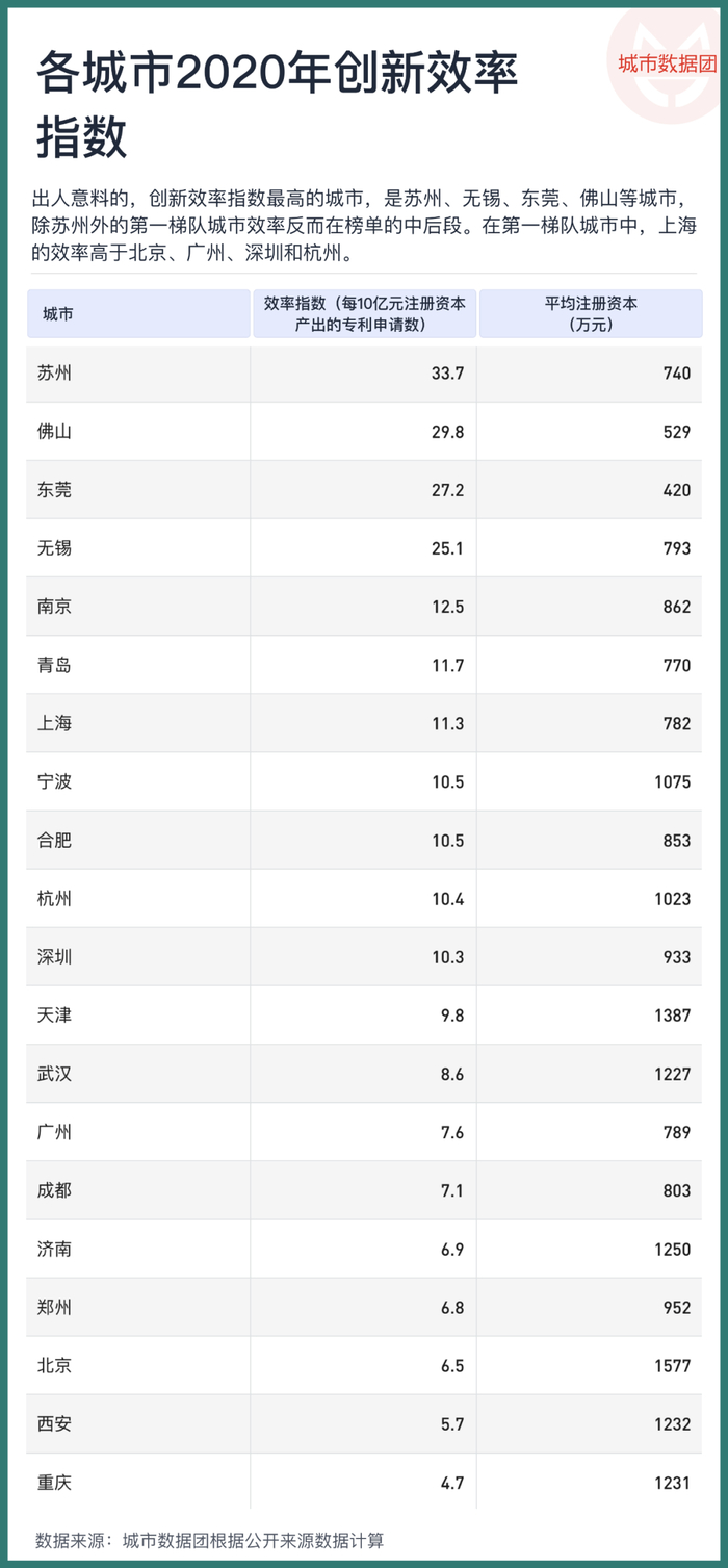 出人意料的,创新效率指数最高的城市,是苏州、无锡、东莞、佛山等城市,除苏州外的第一梯队城市效率反而在榜单的中后段。而在第一梯队城市中,上海的效率则明显高于北京、广州、深圳和杭州。