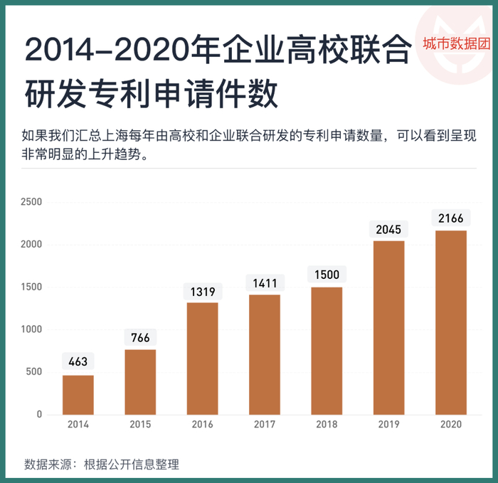 如果我们汇总上海每年由高校和企业联合研发的专利申请数量,可以看到,在城市层面,校企合作也呈现非常明显的上升趋势。