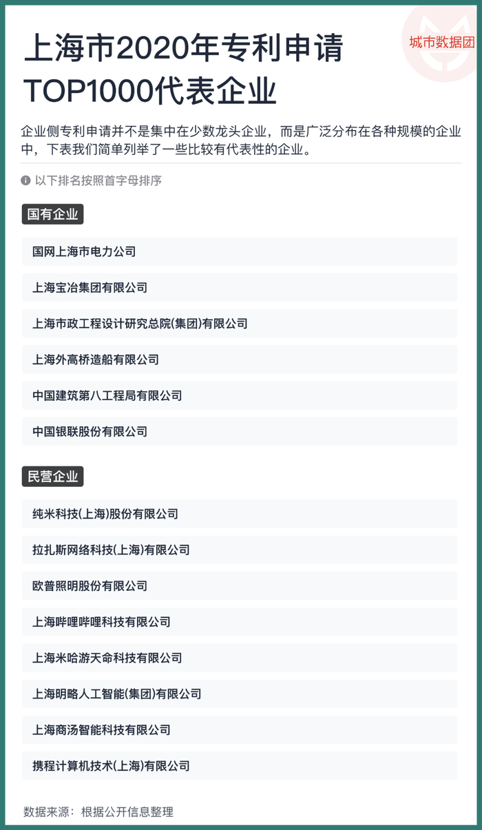 下面我们再来看企业的专利申请情况,上海相比于北京,专利并不是集中在少数龙头企业,而是广泛分布在各个行业、各种规模、各种属性的企业中,即使是专利申请量前1000的企业,其申请总数也仅占到全市总数的57%,在北京,这个数字是80%。下表我们简单列举了一些比较有代表性的企业: