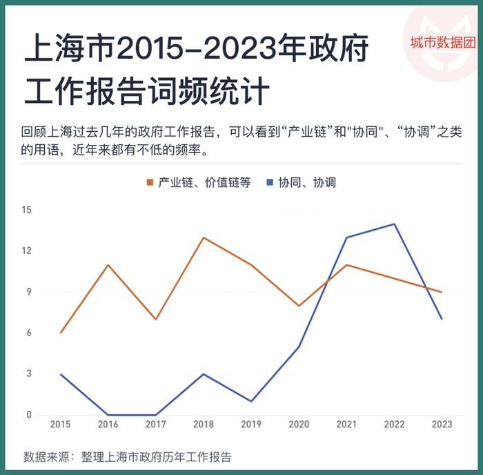 另一方面,产业集群建设的目标,是发挥产业集聚和协同效应,达到1+1>2的效果。政府作为协调和管理者,需要通过制度和法规,规范和促进产业链内部企业的集聚、不同产业链之间的协同以及高校企业之间的信息和技术交流。事实上,如果我们回顾上海的政府工作报告,可以看到“产业链”和"协同"、“协调”之类的用语,近年来都有不低的频率,正是这方面工作的体现。