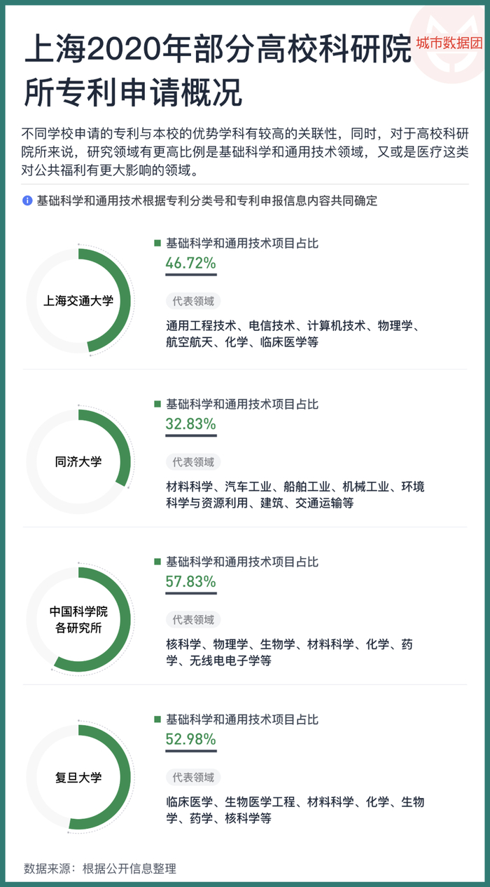 如果进一步观察高校科研院所的专利申请领域,如上图所示,不同学校申请的专利与本校的优势学科有较高的关联性。同时,相对于企业,高校科研院所由于有强大的科研作为支持,申请的专利中有更高比例是基础科学和通用技术领域,又或是临床医疗这类对公共福利有更大影响的领域。