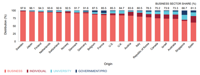 先来看看国际上的普遍情况,根据国际知识产权组织(WIPO)2020年的报告,专利申请者中企业都是绝对的主力,全球平均占比超过85%。