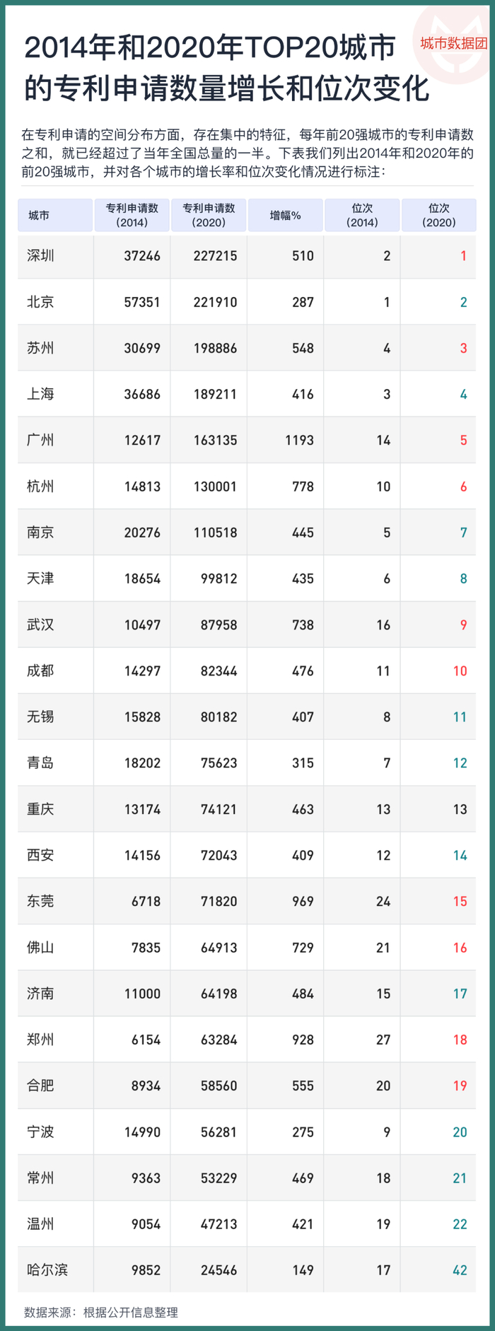 而专利申请的空间分布其实颇为集中,每年前20强城市的专利申请数之和,就已经超过了当年全国总量的一半。下表我们列出2014年和2020年的前20强城市,并列出了各个城市的这几年的增长幅度和位次变化情况