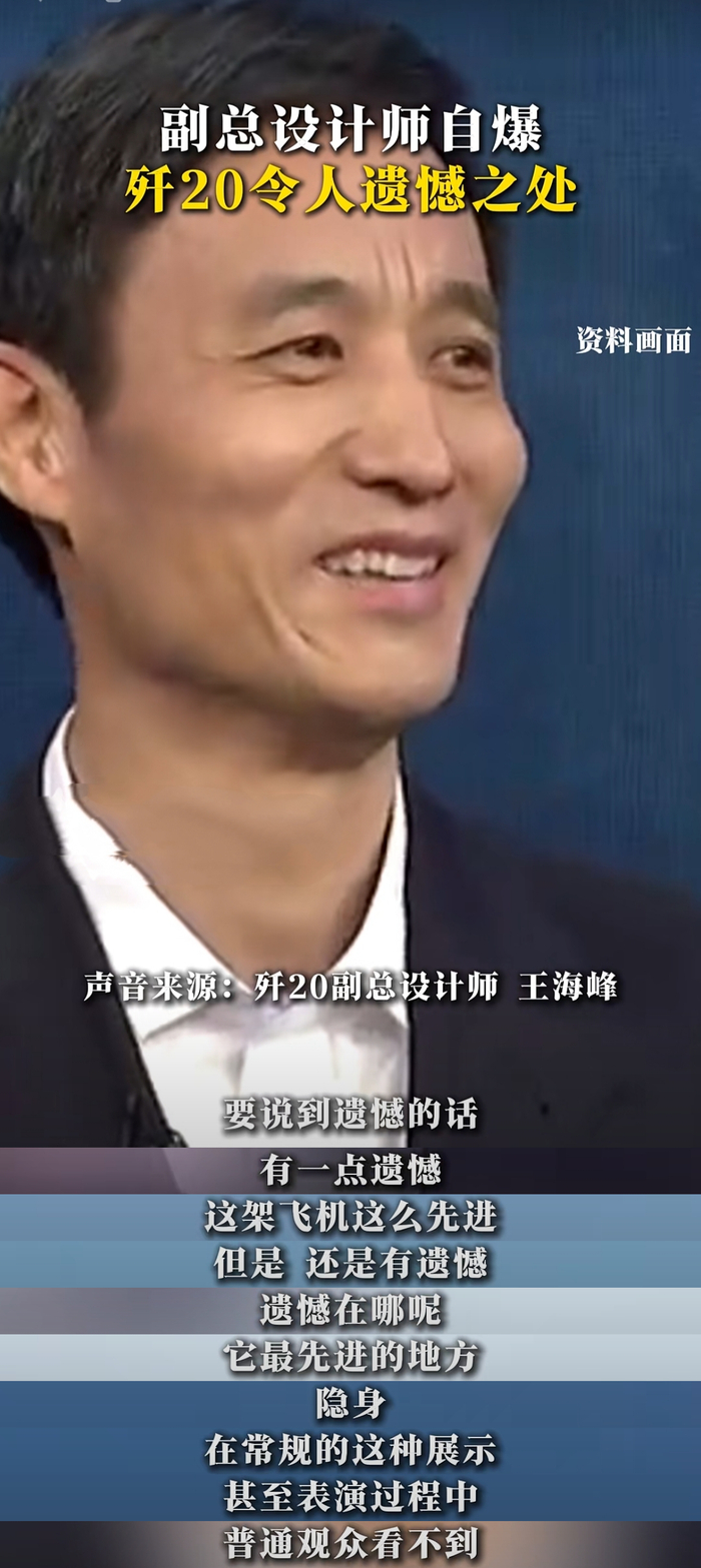 最近被歼 20 副总设计师王海峰的访谈深深震撼,他那 “凡尔赛” 发言,尽显中国航空的强大底气。王总直言:“要说歼 20 有什么遗憾,那就是它太先进了,最先进的隐身性能,在常规展示甚至表演中,普通观众看不到。” 这凡尔赛的话语,满含骄傲,彰显了歼 20 领先世界的技术水平。