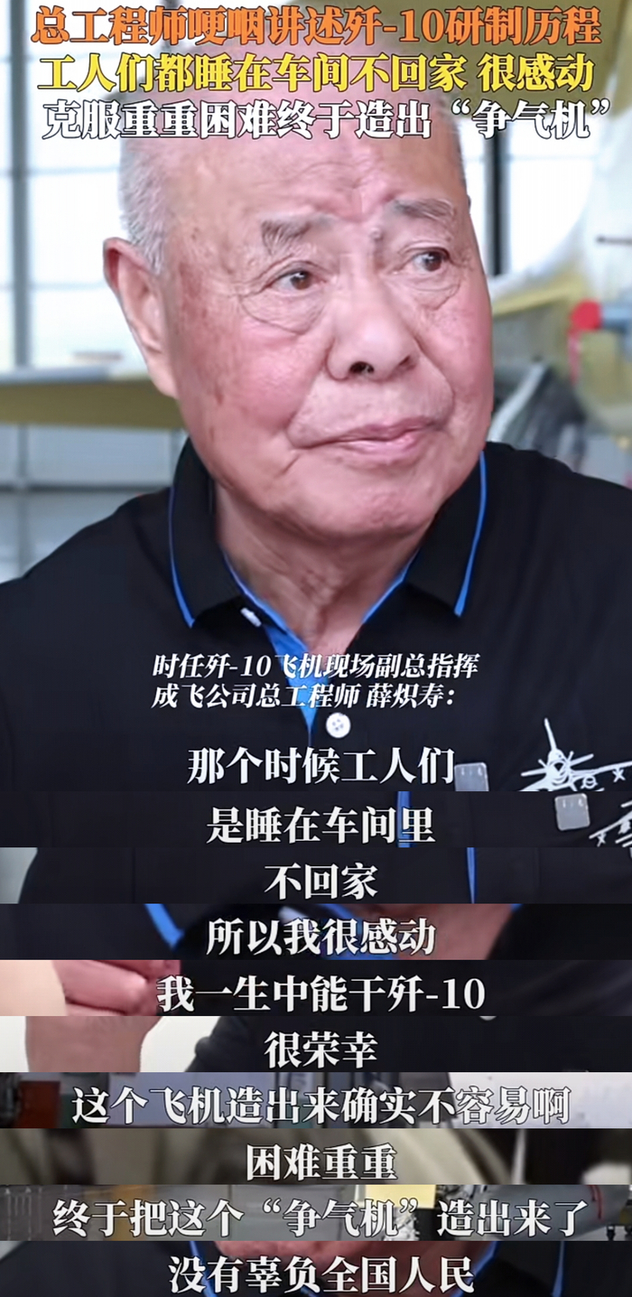 时任歼-10飞机现场副总指挥成飞公司总工程师薛炽寿哽咽这说: 那个时候工人们一是睡在车间里,不回家,我很感动,我一生中能干歼-10,很荣幸,这个飞机造出来,确实不容易啊,困难重重,终于把这个“争气机“造出来了,没有辜负全国人民