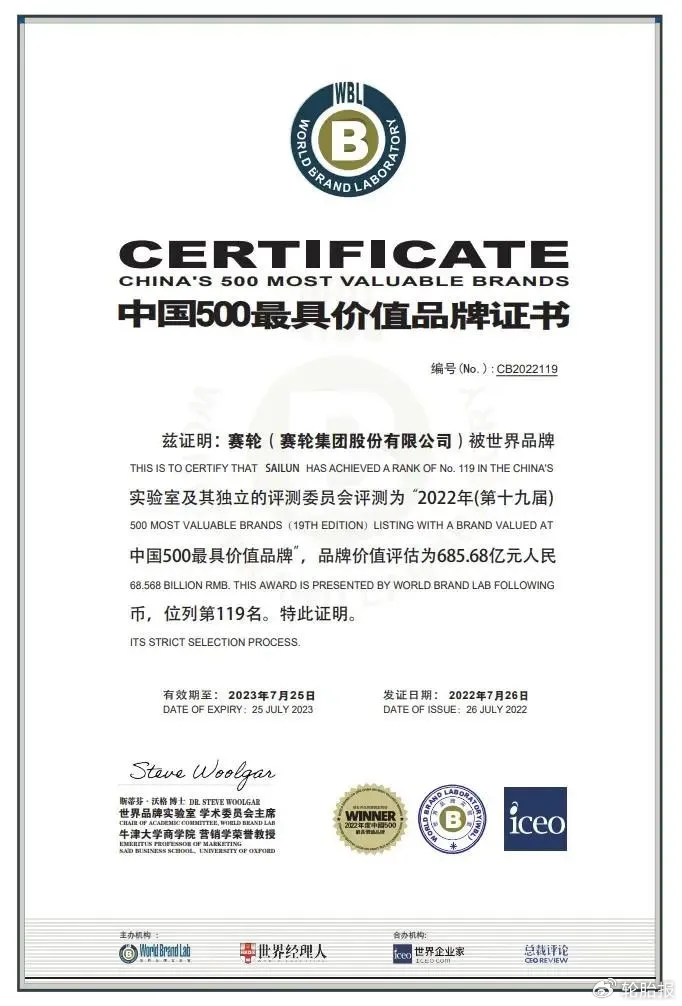 依托“液体黄金”技术,赛轮的产品性能达到国际领先水平,成功打入全球高端市场。在掌门人袁仲雪的带领下,赛轮坚持“产学研用”深度融合,将技术优势转化为品牌护城河,推动品牌价值连续八年跃升。2025年,赛轮以1128.96亿元的品牌价值位列《中国500最具价值品牌》第105位,并首度跻身Brand Finance《全球轮胎品牌价值25强》前十,蝉联中国最具价值轮胎品牌。