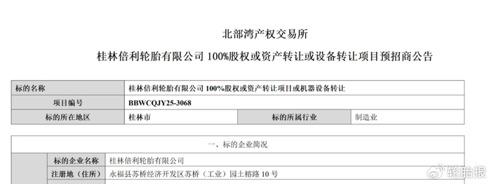 近日,北部湾产权交易所发布了一则备受轮胎行业关注的预招商公告。桂林倍利轮胎有限公司(以下简称“桂林倍利”)正式启动100%股权、资产整体或设备整体转让项目。此次挂牌并未设定具体价格,采取面议方式,为意向方提供了灵活的并购机会。