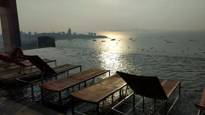 这是我在市中心明星楼盘中心海顶楼的无边泳池所拍,面对芭堤雅的大海,喝着椰子,看着夕阳西下,真的是心旷神怡。