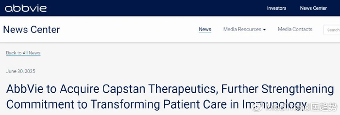 6月30日,艾伯维(AbbVie)宣布以21亿美元现金收购临床阶段生物技术公司Capstan Therapeutics。