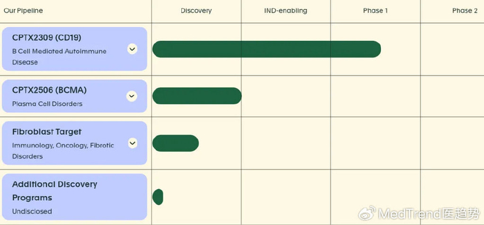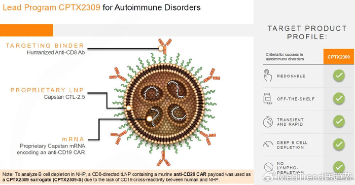 其中,Capstan 处于临床 1 期的主要资产 CPTX2309 是一种潜在同类首创利用tLNP进行RNA递送的CD19 CAR-T 候选药物,开发用于治疗 B 细胞介导的自身免疫性疾病。
