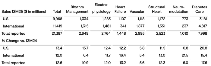 医疗科技业务:营收337.92亿美元,同比增长6.1%。心血管业务以89.3亿美元销售额、15.8%的同比增速成为最大亮点,不仅是医疗技术部门中唯一实现两位数增长的业务单元,更推动整体医疗器械业务迈向新高度。