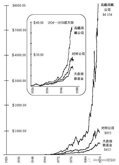 对于这些基业长青的公司,作者推崇备至,事实上,从股价上也能反映出这些公司无以伦比的成功。从下面的图中你可以看得出来,如果在1926年投资1美元到大盘指数基金,你将会得到415美元,如果你投资于一些《基业长青》中提到的对照组公司,也就是很优秀,但是没有达到基业长青公司水平的公司,你的回报将达到955美金,如果你把这1美元投给这些基业长青的公司,你的收益将高达6,356美元。