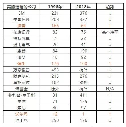 下图是这些公司1996年的世界500强排名和2018年的最新排名的比较: