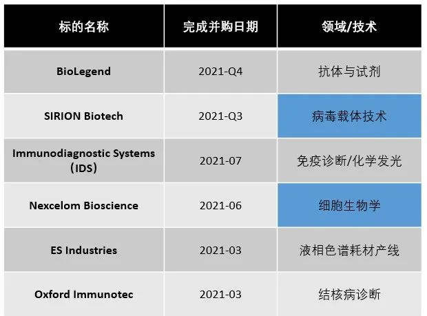 已经宣布了6起并购;主要布局抗体、病毒载体、免疫化学发光、细胞生物学等领域;进一步巩固免疫诊断市场地位。